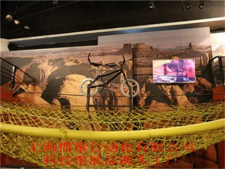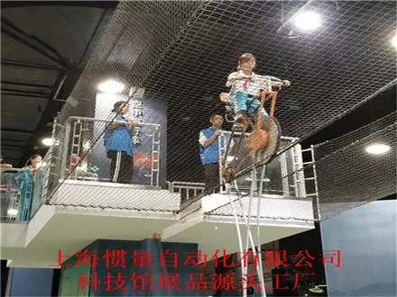 展项设置一个高2米的平台,与对面柱子间用绳子连接起来,自行车位于绳子上,其下方悬吊着重物。科技馆展品制作生产源头工厂-上海惯量自动化有限公司提示大家这样自行车和参与者重心的中点就转移到支点下方了,会对骑车人的偏移起到纠正作用。参与者走上楼梯,来到入口平台,在工作人员的的协助下骑上自行车,骑行到另一端,在高空绳索上保持平衡,然后倒骑自行车返回平台。科技馆展品制作生产源头工厂-上海惯量自动化有限公司提示大家绳子下方设有安全网,参与者身上系有安全带,以便确保安全。