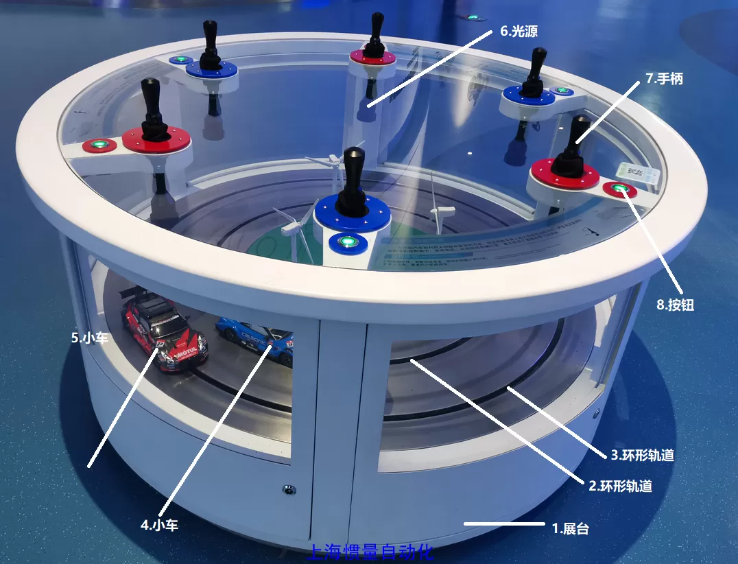 展品位于生活科技厅能源与环境展区,展示太阳能的用途。主要由一个圆形展台(标记1)、展台内部两条环形轨道(标记2、3)、两台安装有太阳能板的小车(4、5)、若干光源(标记6),若干手柄(标记7)、若干按钮(标记8)等组成。每一个手柄对应一个光源和按钮,两台安装有太阳能板的小车分别在两条环形轨道上行驶。当观众按下按钮,对应的光源被点亮,此时,操作手柄使光源对准小车,由于光能发电的原理,小车被驱动行驶。每一个手柄、光源都设有限位装置,当小车行驶出光源所能照射的范围,无法获得能量,则小车停止。这时可启动另一光源,继续驱动小车行驶。可最多两名观众同时操作进行比赛。光源启动后一段时间自动熄灭。